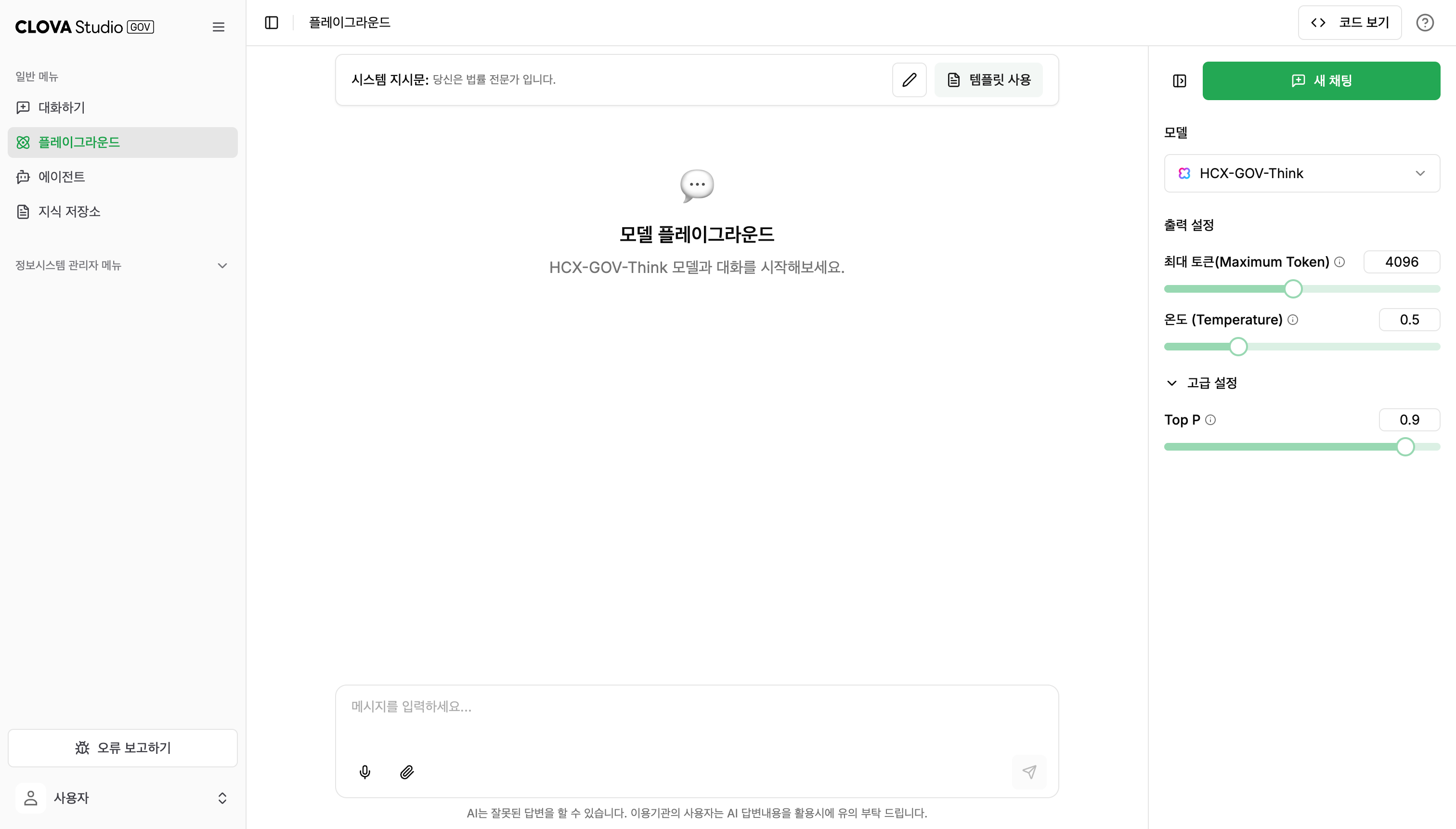테스트할 언어 모델을 선택합니다 (HCX-GOV-THINK, HCX-GOV-VLM, LLM42 등).
